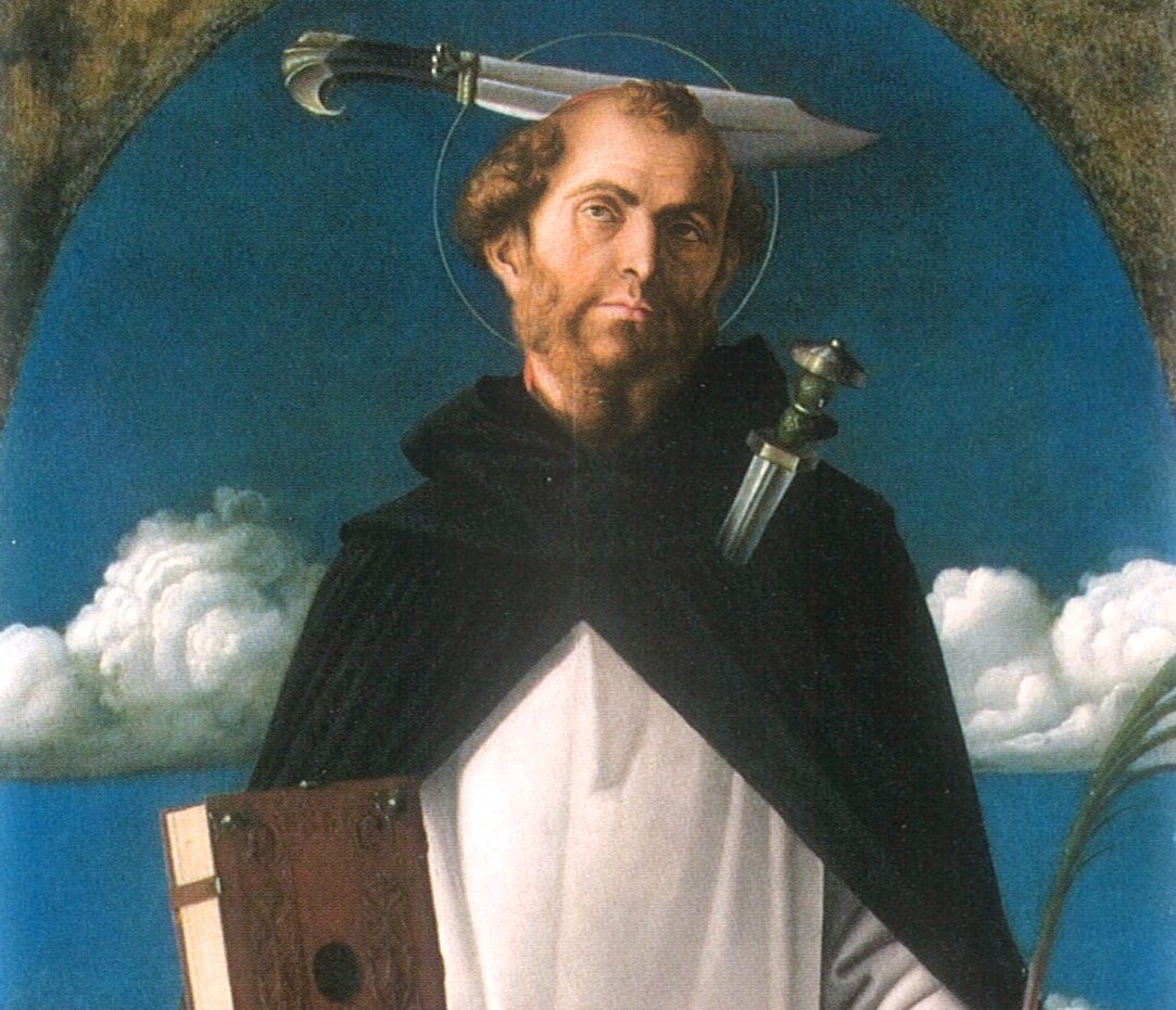 Tutto nasce dal formato piuttosto insolito del dipinto (cm 194 x 84), lungo e stretto, cosa che indusse nel 1937 Carlo Gamba ad avanzare l’ipotesi che esso fosse la parte centrale di un trittico smembrato i cui scomparti laterali potevano a suo parere riconoscersi in due tavole della Galleria Nazionale di Zagabria, raffiguranti rispettivamente Sant’Agostino e San Benedetto, entrambi in piedi, proiettati su uno sfondo di cielo azzurro, di misure sensibilmente diverse rispetto alla tavola di Monopoli (cm 108,7 x 42,3 ognuna), ma come questa a terminazione centinata. Gli studi successivi hanno per lo più rigettato questa ipotesi, sulla base di considerazioni cronologiche ma anche per le dimensioni difficilmente compatibili. Io mi pongo, ma con qualche dubbio, fra coloro che non sono favorevoli all’ipotesi del Gamba; esiste comunque la possibilità che il nostro San Pietro martire nella sua collocazione originaria fosse al centro di un altare cinquecentesco dorato, che poteva dare il massimo risalto all’immagine isolata del Santo.