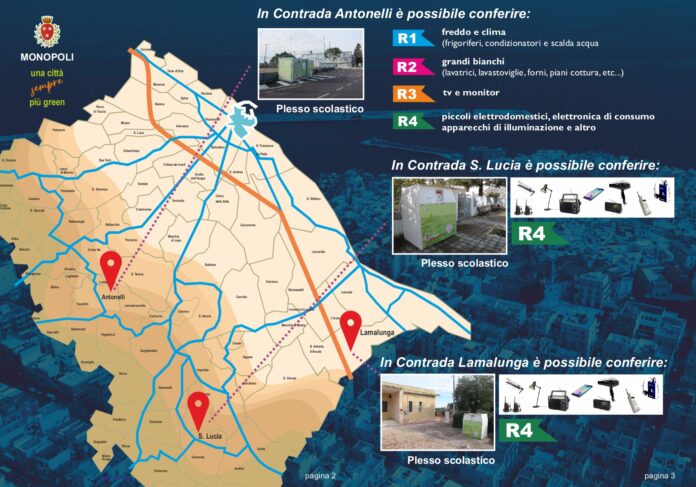 Con l’obiettivo di potenziare il servizio di raccolta differenziata nelle contrade, sono già attive sul territorio dell’agro monopolitano due moduli Mini RAEE nelle contrade Santa Lucia e Lamalunga e un modulo RAEE ecoisola a 4 moduli monolato in contrada Antonelli.