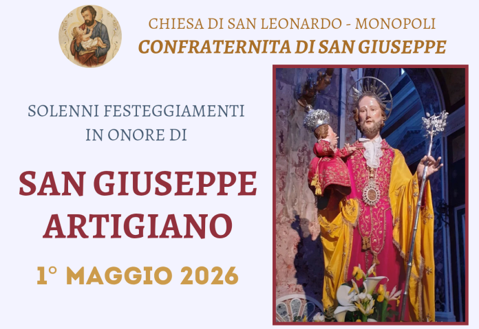 La Confraternita di San Giuseppe, nella Chiesa di San Leonardo, si prepara a vivere le Celebrazioni in onore del suo Patrono nella ricorrenza del 1 Maggio. Domenica 26 Aprile sarà esposta l’antica Immagine di San Giuseppe e al termine della Santa Messa delle ore 8.30 sarà solennemente venerata. Giovedì 30 Aprile, vigilia della Festa, alle ore 17.50 sarà recitato il Santo Rosario cui seguirà la Coroncina al Santo. Alle ore 18.30 avrà luogo la Solenne Celebrazione dei Vespri cui seguirà la presentazione dei lavori di restauro che hanno interessato l’antico abito del Santo.